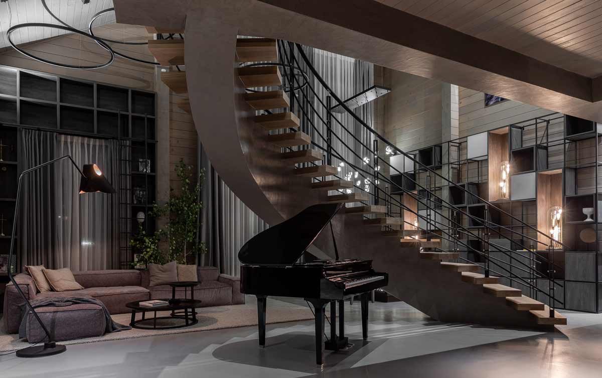 Сердцем дома стала разноуровневая гостиная, в двусветном пространстве которой расположили диванную зону с баром.