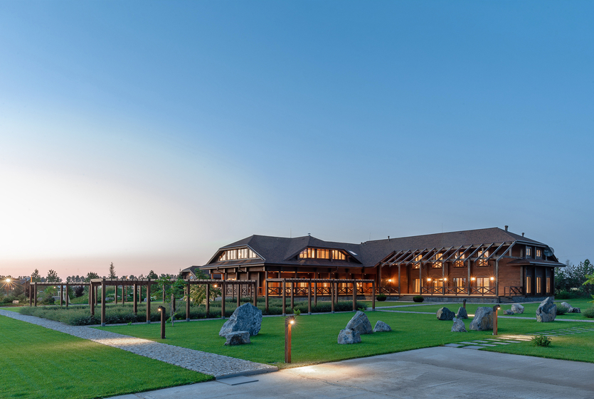 Изначально заказчик планировал построить на приобретенном участке с видом на Алтайские горы дом, который будет использоваться в качестве дачи, где семья будет жить пару месяцев в году, но в процессе работы проект менялся. Появились дополнительные помещения, в том числе бильярдная, сауна, комнаты для гостей, погреб для хранения вина и продуктов. Возникла необходимость в хозяйственном блоке с домом для персонала. Так площадь дома выросла до 900 квадратных метров. Площадь второго дома составила 315 квадратных метров. Крыло для обслуживающего персонала архитекторы соединили с главным зданием крышей-навесом, крытой галереей. Получилась целостная, связанная воедино композиция из двух зданий и гаража.